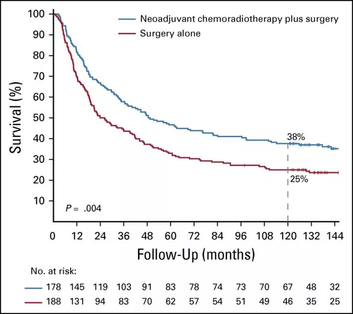 首次分析显示,两组的短期毒性均较低,新辅助放化疗后手术组和单纯手术组患者的2年生存率分别为67%和50%。5年的随访数据与最初的报告一致。研究人员指出,这种疗法的长期益处和危害尚不清楚。新辅助放化疗的副作用可能导致食管癌以外的其他原因导致的长期死亡,而且可能不能预防,而仅仅是推迟癌症相关的死亡。本次分析的目的是确定观察到的益处是否持续超过5年。