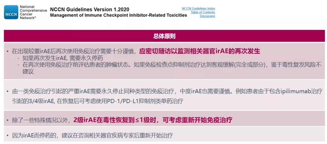 对于1级-2级CIP,激素治疗敏感者,考虑再挑战;部分3级CIP,激素治疗敏感且恢复良好者,考虑再挑战;对于肺基础疾病严重、激素治疗后吸收缓慢、无法8-12周内完全停药或一次CIP后肺功能受损严重者,不建议再挑战。接受再挑战的患者,除了定期评估疗效外,应严密监测毒副作用,包括CIP以及其他irAE,如再次出现CIP复发,则治疗后不再考虑再次挑战。再挑战用药选择方面,如初始为一类免疫治疗引起的严重irAE,需永久停止同类型免疫治疗,中度irAE也需要谨慎,关于换药再挑战的风险及疗效如何,目前尚无更多数据支持。