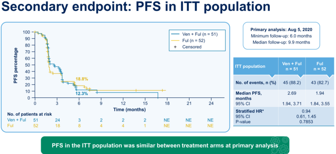 初步分析结果(截至2020.8.5),103名ITT患者中,两组中位年龄分别为58岁和59.5岁,两组CBR相似,VEN+FUL组CBR 11.8%(n=6/51;95%CI:4.44~23.87),FUL组CBR:13.7%(n=7/51;95%CI:5.70~26.26)(95%CI:-16.86~12.94)。BCL2 high/low亚组与ITT人群的CBR和PFS结果相似。观察到的3~4级不良反应发生率两组分别为26%(n=13/50)vs 11.8%(n=6/51)。更新数据截至2020.10.22,OS数据尚未成熟,VEN+FUL组mOS为16.76 个月(HR 2.56,95%CI 1.11~5.89),FUL单药组未达到(HR:2.06[1.04~4.09])。