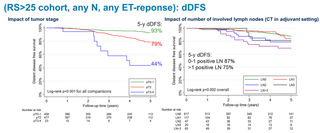 结果:5625名患者接受了筛查,4621名患者(ITT)进入了试验。中位随访4.9年后发现,较高的基线和内分泌治疗后Ki67水平与较差的iDFS相关(均P <0.001)。在化疗组(n=2331)中,高RS、淋巴结状态和肿瘤大小通常与较差的iDFS相关。然而,N1和N0状态仅在年轻患者(<50岁)中存在iDFS的差异。在LN>4阳性的患者中(n=390),低RS与iDFS改善相关(RS0-11 vs RS>25:plog rank=0.016,5y iDFS 90%vs.64%)。在RS>25(n=965)的患者中,低Ki67、N0期和c/pT1期与iDFS改善相关。尤其是内分泌治疗应答者的5年iDFS(84%)高于内分泌治疗无应答者(77%;plog-rank= 0.04)。接受化疗后的N0-1期RS 12-25/内分泌治疗无反应年轻患者(<50岁)的5年iDFS(89%)与单纯内分泌治疗的内分泌治疗反应型患者的5年iDFS(92%)相比,无显著性差异(plog-rank=0.249)。