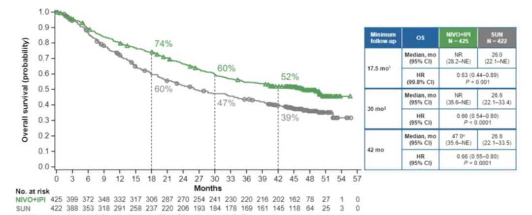 Prof. McKay:这需要视具体情况而定。我首先想的第一个问题是“患者需要治疗吗”。一些低危的、转移负荷低的患者,甚至可以等待观察。假如需要治疗,那么下一个需要考虑的问题是“IO-IO方案还是IO-VEGF方案”。CheckMate-214研究随访42个月的数据提示,NIVO-IPI组的OS已达47个月,可降低34%的死亡风险;而且可以看到生存曲线的“拖尾效应”,即随着时间推移,患者可保持稳定、持久的获益,甚至有部分患者可以“治愈”。