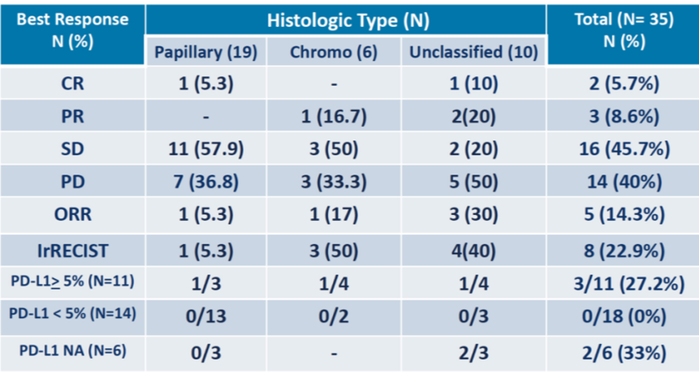 然而,非透明细胞疾病包括众多类型,组织学和生物学差异很大,所以并非所有患者均有相同的治疗反应。我认为乳头状、基因易位型以及未分类nccRCC的治疗反应更好,而嫌色细胞肾癌对免疫治疗的反应不佳。我们报道的ORACLE研究是临床实践中有关此类患者联合治疗的真实数据,实际上这些患者对联合治疗是有不同程度的治疗反应。