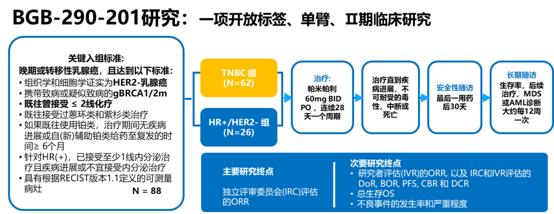 帕米帕利BGB-290-201研究是一项开放标签、单臂、II期研究,在中国25家中心开展,旨在探索帕米帕利用于携带gBRCAm晚期或转移性TNBC和HR+/HER2-乳腺癌患者的疗效和安全性,是迄今为止首个PARP抑制剂专门针对中国gBRCAm乳腺癌开展的临床研究1。国外虽然有PARP抑制剂获批用于晚期HER2阴性gBRCAm乳腺癌治疗,但这些国际多中心III期研究仅纳入少量中国患者,比如OlympiAD研究在中国大陆仅入组32例患者,而EMBRCACA研究未在中国开展。BGB-290-201研究在国内入组BRCA突变患者达到88例,此次是迄今为止PARP抑制剂在中国晚期gBRCAm乳腺癌中进行的最大样本量临床研究数据发布1,3,对我们了解PARP抑制剂在中国乳腺癌治疗有很好的指导借鉴意义。