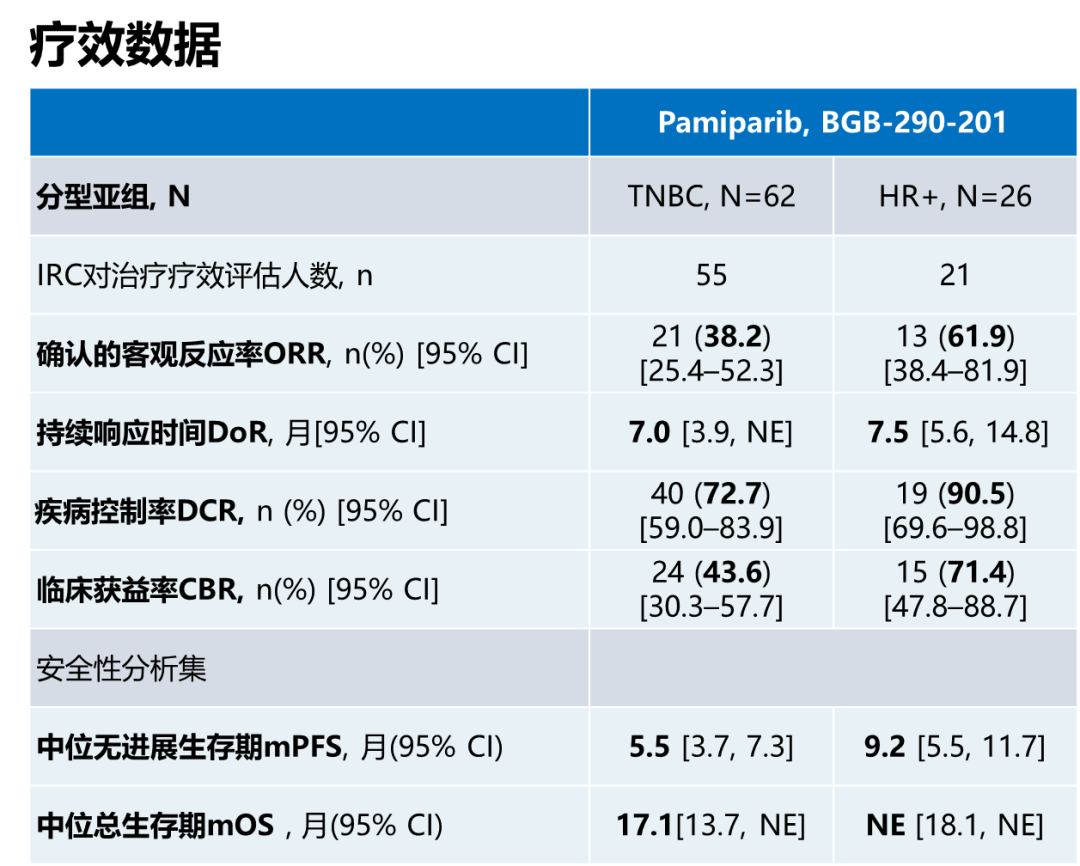 疗效数据需要结合入组基线特征比较分析才能发现产生差异的原因。BGB-290-201研究与同类研究相比,TNBC组纳入较少的未接受过化疗患者(仅为27.4%),而且有更高的既往使用过铂类比例(TNBC组为50%,HR+/HER2-组为42.3%),中国专家更接受铂类在晚期TNBC一线应用,而国外专家更多将铂类应用在(新)辅助阶段,因此国外研究人群有更长的无铂间隔。BGB-290-201研究入组人群中应用过铂类比例相对较高,无铂间隔相对较短,这可能是帕米帕利在TNBC组ORR数据略低的主要原因。