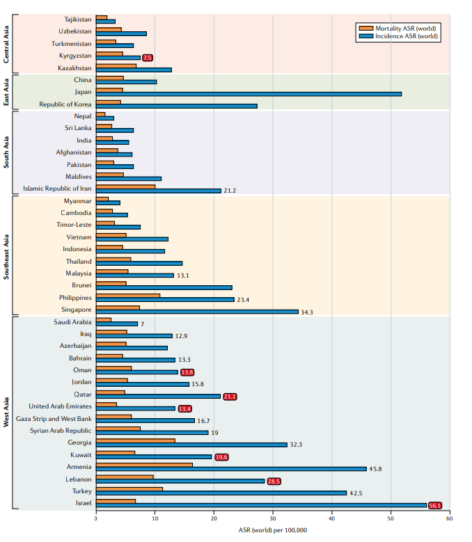 Fig.1 2020年亚洲国家前列腺癌的年龄标准化发病率和死亡率。如果前列腺癌是男性最常见的三种癌症之一,则提供发病率数字;如果前列腺癌是该国男性最常见的癌症,那么这个数字就是红色的。图中所示的数据最初来自GLOBOCAN 2020研究。ASR,年龄标准化率(世界)每10万人。