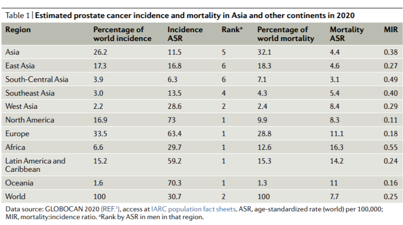 前列腺癌的发病率和死亡率因全球各地的地理区域而异。作为世界上最大的大陆,亚洲占世界人口的近60.4%。然而,根据GLOBOCAN 2020年的估计,2020年亚洲的前列腺癌新发病例和死亡病例仅占全球的26.2%和32.1%。2020年,亚洲前列腺癌发病率的年龄标准化率(ASR)为每10万男性中有11.5人,为全球发病率最高的北美大陆(每10万人中有73人)的六分之一。相比之下,与发病率相比,前列腺癌死亡率的差异较小:亚洲前列腺癌死亡率的ASR为每10万人中有4.4人,约为全球死亡率最高的非洲(每10万人中有16.3人)的四分之一。死亡率与发病率的比率(MIR)是评估生存率和早期诊断的次要指标。因此,亚洲的MIR(0.38)比北美(0.11)高出三倍左右。相应的,北美大陆5年的前列腺癌患病率是亚洲的10倍,分别为每10万男性中有509.3人和49.6人。