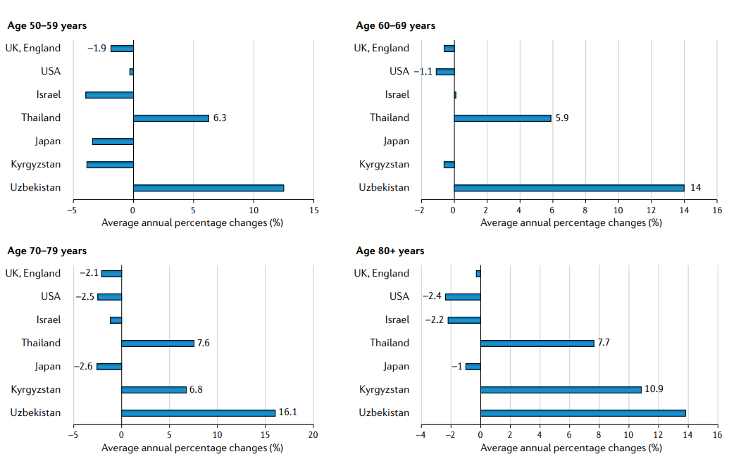 随着前列腺癌发病率的增加,亚洲人口正在迅速老龄化,到2050年60岁及以上的人口将达到18%,而2019年只有8%。发现在年龄高于 70岁成年人群体中,泰国(AAPC = 7.6%)和乌兹别克斯坦(AAPC = 16.1%)的前列腺癌死亡率显著增加(图3)。适当的预处理评估,根据病人的功能但不只是年龄调整治疗,和监测不良事件,在这种情况下是至关重要的。