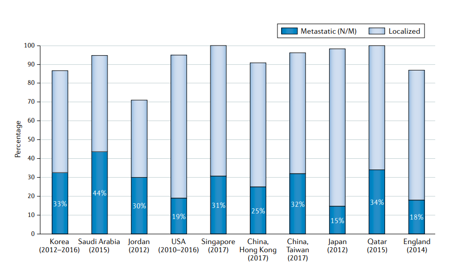 除日本以外,所有亚洲国家的晚期疾病发病率(范围在25-44%)都高于美国(19%)(FIG4) 这种现象的部分原因是在2008-2018年间采用了日本泌尿外科协会推荐的前列腺癌筛查。2010年,68%的日本地方市政当局将基于人口的PSA筛查作为一项公共服务开展;在其他类似的发达国家,如韩国和新加坡,这些国家没有在全国范围内进行前列腺癌筛查,也没有专业医疗保健协会的推荐,近三分之一的男性在诊断时出现转移性疾病。尽管很难获得有关分期的全国数据,但亚洲发展中国家转移性疾病的流行率甚至更高。
