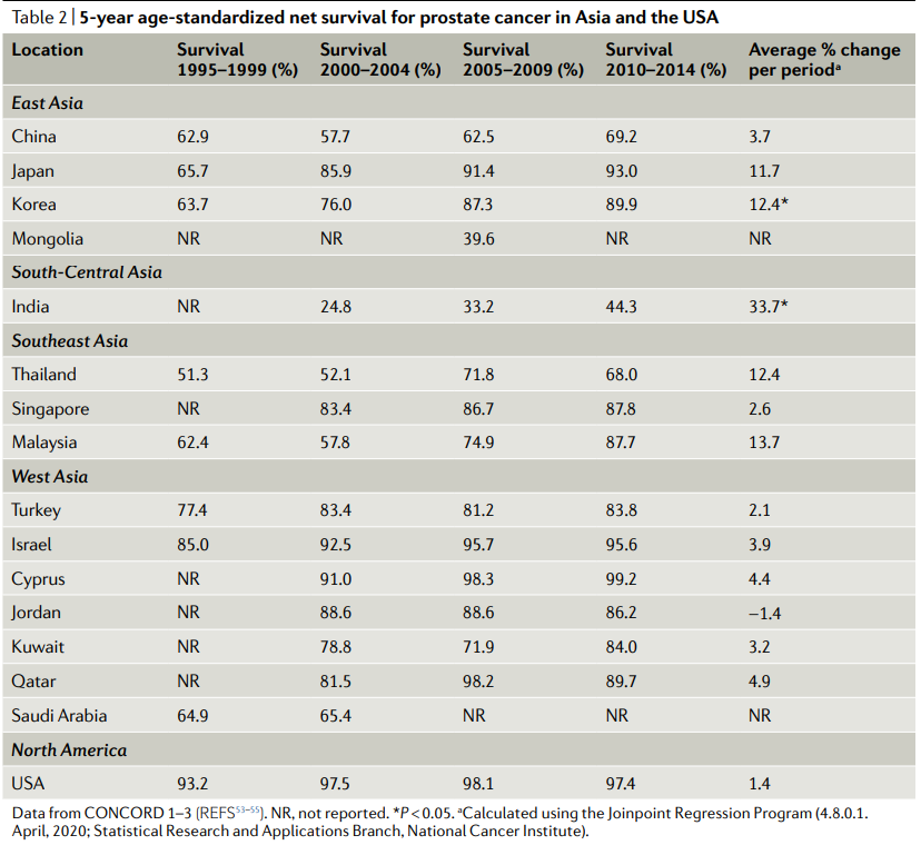 Table2:亚洲和美国前列腺癌5年标准化净生存率