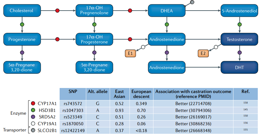 药物基因组学和睾酮。一些研究发现,亚洲患者的ADT结果可能比北美患者更有利。一项对22293名北美新发转移性前列腺癌男性的人口数据库综述评估了种族对总生存率的影响。该研究报道,亚裔美国男性的总生存率(30个月)高于美国白人、黑人和美国土著男性(23-25个月,P < 0.001)。此外,亚洲男性前列腺癌特异性生存期(54个月)明显长于其他种族背景的男性(35-40个月,P < 0.001)。在多变量分析中,来自亚洲或太平洋岛屿种族背景的男性与白人男性相比死亡率降低了19%。然而,这个基于人群的数据库不包括患者接受的治疗信息。另一项针对日本和美国前列腺癌男性的跨太平洋的比较研究显示,与美国相比,日本患者经过ADT后前列腺癌特异性死亡率降低了48%。不同的基因控制着雄激素的合成、分配和运输途径,并调节ADT的作用(图5),不同的关键基因(HSD3B1、SRD5A2、SLCO2B1、CYP19A1和CYP17A1)的种族差异可能导致了前列腺癌的这种独特生物学特性。虽然这些基因的单一变异可能产生中等效果,但累积效应可能能够区分个体对ADT的反应。因此,比较研究东亚和北美的队列可能阐明ADT应答的遗传特征,有助于计划在初级和/或辅助ADT环境下减少治疗。