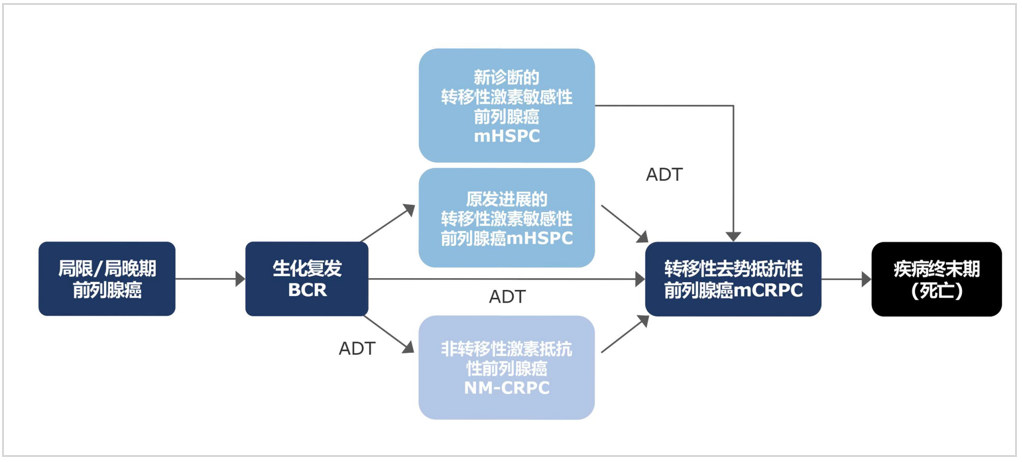 临床上,可将前列腺癌的疾病过程大致分为:局限/局晚期前列腺癌→生化复发(BCR)→mHSPC或NM-CRPC→mCRPC→疾病终末期(死亡)。随着疾病进展到mHSPC或NM-CRPC阶段,死亡风险增加3倍[9]。