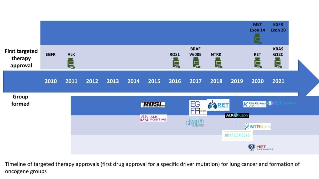 图. 肺癌靶向疗法的批准和致癌基因的患者倡导组织建立的时间表