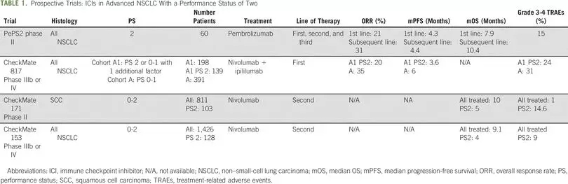 一些免疫治疗研究纳入PS评分差的晚期NSCLC患者,其中III期PePS2试验的研究人员发现,36%的患者在接受帕博利珠单抗治疗时获得了持久的临床获益,其总体缓解率 (ORR)为31%,中位无进展生存期 (PFS) 4.4个月,总生存期(OS)为10.4个月。“这些结果与KEYNOTE-001的数据相当,KEYNOTE-001包括PS 0-1的患者,”渥太华大学Sophie Stock-Martineau等人观察到。