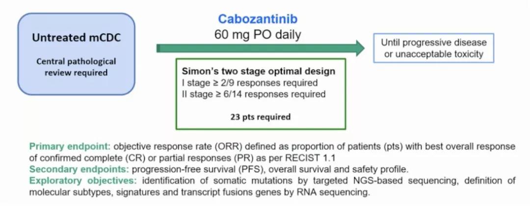 方法:这项前瞻性、单中心、II期试验评价了卡博替尼(cabo))60mg对未经治疗的转移性集合管肾细胞癌患者(PTS)的治疗效果。主要终点是根据RECIST 1.1评估的客观缓解率(ORR)。次要终点为无进展生存期(PFS)、总生存期(OS)和安全性。探索目标包括:通过靶向DNA测序鉴定体细胞突变;通过RNA测序确定分子亚型、分子标签和转录融合基因。有强制的中心病理学回顾。这项研究基于Simon的两阶段最优设计。