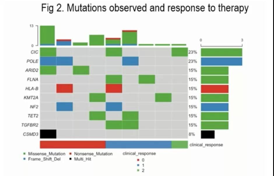 21例(91%)患者DNA测序成功。所有肿瘤均为微卫星稳定。未观察到肿瘤突变负荷与对卡博替尼治疗反应之间的关联。受影响最大的途径是染色质修饰酶(46%)和适应性免疫系统(23%)。治疗有反应患者(PFS>6个月)表现为高突变频率影响去泛素化、细胞间通讯和TGF-b信号转导。无反应患者常发生染色质重塑、转录调控和WNT途径的突变。