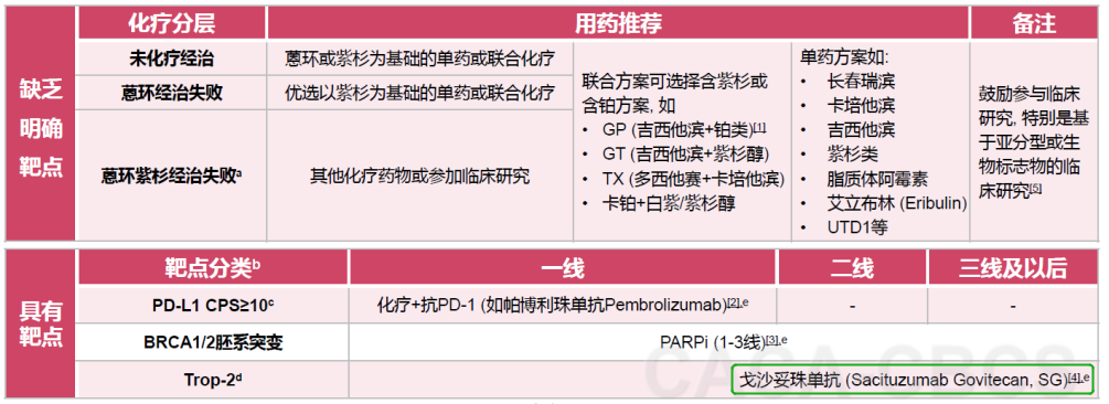 近年来,PD-1/L1免疫检查点抑制剂、PARP抑制剂、Trop-2抗体偶联药物的出现,为TNBC提供了精准治疗的靶点药物。在近日更新的《中国抗癌协会乳腺癌诊治指南与规范(2021版)》(以下简称CBCS指南)、《ESMO转移性乳腺癌患者诊断、分期和治疗的临床实践指南》(以下简称ESMO-MBC指南)等两部权威指南中,均是遵循“有无靶点(标志物)”进行分层决策。