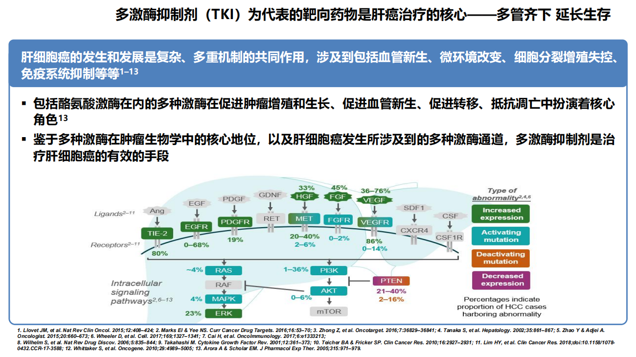 从分子层面上来看,肝癌在实体瘤中可成药靶点的比例非常低,可能跟肝癌的高度分子异质性有关。肝癌的发生发展是一个复杂的多因素、多步骤的过程,涉及到包括新生血管形成、微环境改变、细胞分裂增殖失控以及免疫系统的抑制等多个环节。从这个角度来讲,多靶点的酪氨酸激酶在促进肿瘤增殖和生长、促进新生血管形成、促进转移、抵抗凋亡中扮演着核心角色,因此,多靶点的TKI是一个比较好的靶向治疗策略。