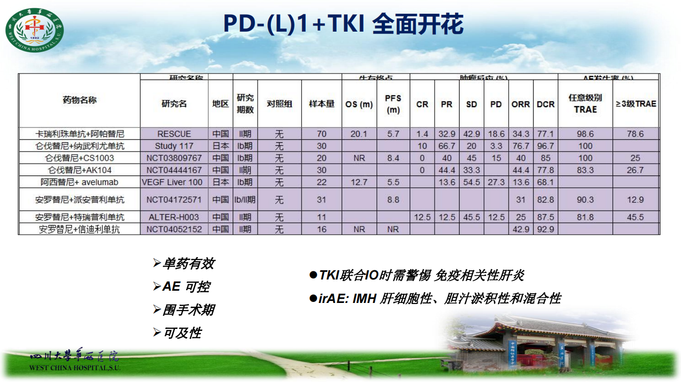 更多的组合集中在PD-1或者PD-L1单抗联合TKI,除了这些研究以外,还有“幸福”组合——信迪利单抗联合呋喹替尼,在肝癌的二线也有小样本的研究。从这些研究结果来看,PD-1或PD-L1单抗联合TKI总体的有效率和安全性还是不错的,但是比PD-1或PD-L1单抗联合贝伐珠单抗的肝脏毒性更明显,可能主要还是跟TKI的使用有更大的相关性。从疗效上看,我个人更看好TKI联合PD-1或者PD-L1单抗,因为相对于贝伐珠单抗联合免疫检查点抑制剂(CPI)而言,TKI联合CPI时的两个单药都是实际上有效的,而贝伐珠单抗的单药,在肝癌的治疗有效率比较低。其次,TKI药物的可及性更好。第三,TKI围手术期应用的安全性更好。当然,需要充分观察患者的不良反应,特别是肝脏毒性这也是临床上更加值得注意的一个问题。目前我们还期待大型的三期临床研究来验证这样的一个idea,包括大家熟悉的“可乐”组合、“双艾”组合,都需要去验证TKI跟免疫检查点抑制剂联合的机制。