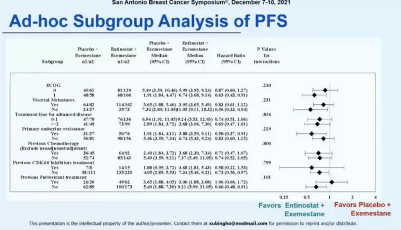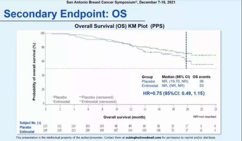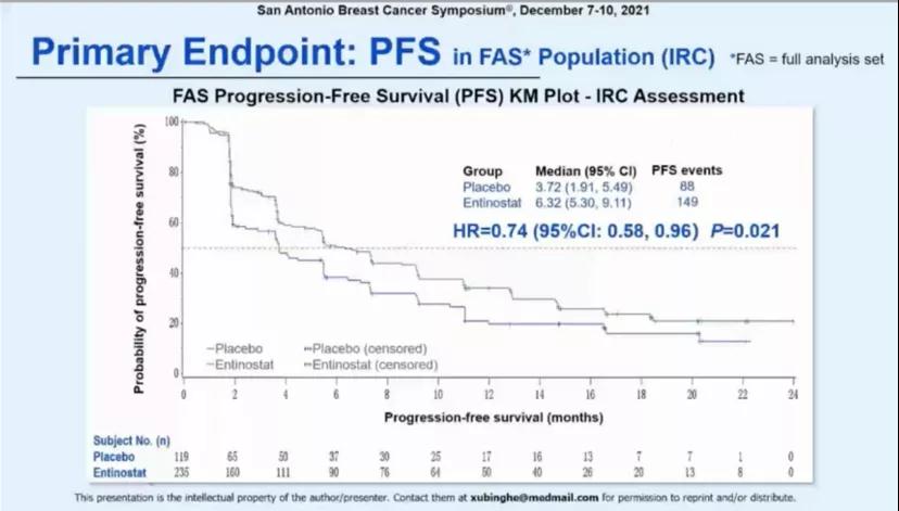 研究于2019年4月16日~2020年5月13日期间共入组354例患者,其中235例随机分入entinostat组,119例分入安慰剂组,IRC评估的两组中位PFS分别为6.32个月(95% CI:5.30~9.11)和3.72个月(95% CI:1.91~5.49),HR=0.74(95% CI:0.57~0.96, P<0.001)。
