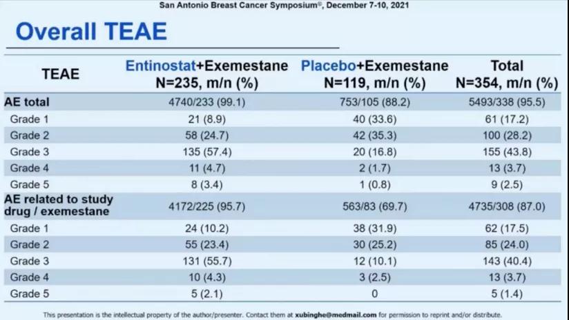 两组中最常见的3-4级不良事件分别为中性粒细胞减少(entinostat组103例/43.8%,安慰剂组1例/0.8%)、血小板减少(entinostat组20例/8.5%,安慰剂组1例/0.8%)和白细胞减少(entinostat组15例/6.4%,安慰剂组0)。entinostat组共发生28例严重不良事件(11.9%),安慰剂组共发生11例严重不良事件(9.2%)。