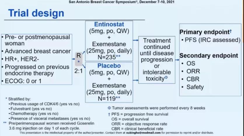 入组患者由中心交互式网络应答系统,按按2∶1比例进行随机化分层,分别在每日口服25毫克依西美坦的基础上,再口服5毫克entinostat或安慰剂,随机化过程中还将根据既往是否使用过CDK4/6抑制剂、氟维司群、化疗和是否有内脏转移进行分层。