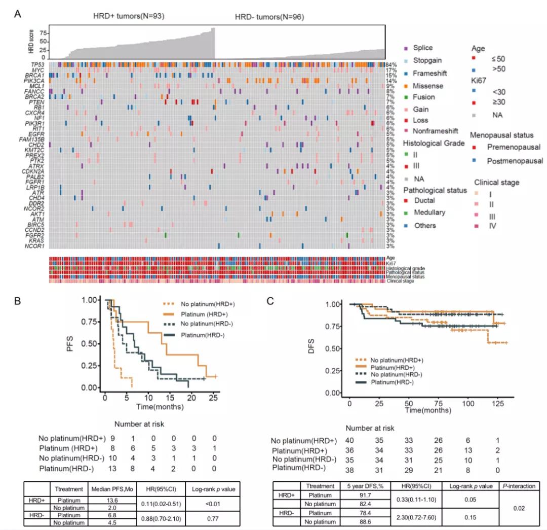 基于中国医学科学院肿瘤医院的189例三阴性乳腺癌患者,包括149例早期队列TNBC患者(前瞻性队列NCT01150513),及40例晚期队列的TNBC患者(回顾性队列),各队列分别接受含铂方案或不含铂方案治疗,评价各组疗效及预后。同时对患者的组织进行HRD(homologous recombination deficiency,HRD)状态检测。本研究中HRD算法基于杂合性缺失(Loss of heterozygosity,LOH)、端粒等位基因不平衡(Telomeric allelic imbalance,TAI)和大片段迁移(Large-scale state transition,LST),利用分布在人类基因组中10,000多个单核苷酸多态性来评估基因组的不稳定性,并根据染色体倍数和纯度进行调整,最终定义HRD阳性为HRD评分≥30和/或BRCA1/2存在有害突变。本研究分析HRD状态与含铂方案治疗疗效的相关性,评价HRD能否为有效预测铂类药物疗效的生物标志物。