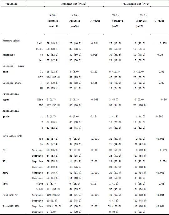 ■ 研究方法:本研究一共回顾分析了2012年1月至 2020年12月的257名 cN+乳腺癌患者,总共179和78名患者分别被随机分配到训练集和验证集。患者的中位年龄为50岁(范围 23-75 岁)。这些患者在新辅助化疗后均接受了前哨淋巴结活检和腋窝淋巴结清扫术。