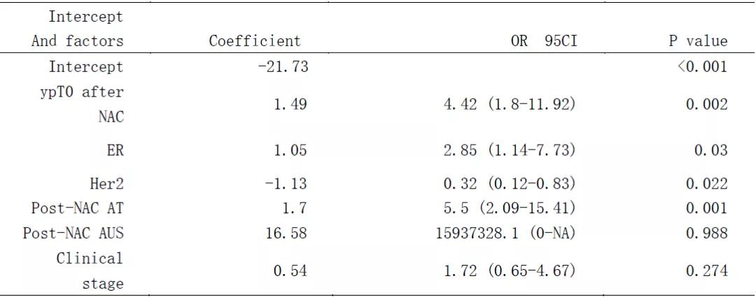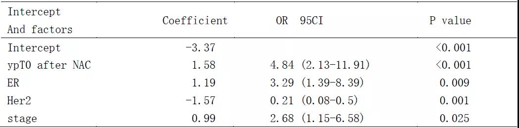 在单变量分析中,四个因素的p<0.05,包括 ycT0,NAC 前的临床分期,雌激素受体表达,HER2状态,考虑为非前哨淋巴结转移的独立预测因子。随后,这些因素被纳入多变量分析以构建临床模型。