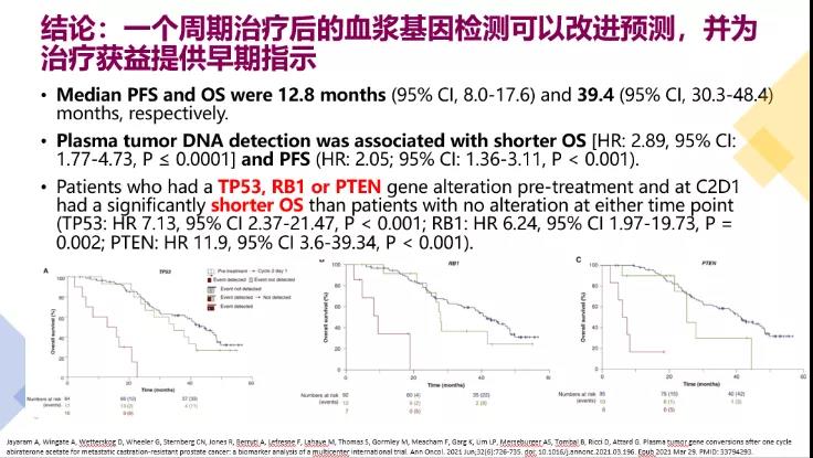 mCRPC的预后一直都是临床医生重点关注的问题,对于使用阿比特龙治疗的患者,如果存在TP53、RB1或PTEN突变的话,预后较差。此研究提到了阿比特龙治疗mCRPC后液体活检发现血浆基因的转换。研究结果显示,如果这些基因改变在治疗一个周期之后清零,那对于此类患者的预后是相当不错的。如果这些基因不能清零,那这些患者的预后较差。所以前列腺癌的治疗不能单看患者基线的情况,也要根据治疗以后的相应改变对治疗做出动态调整。