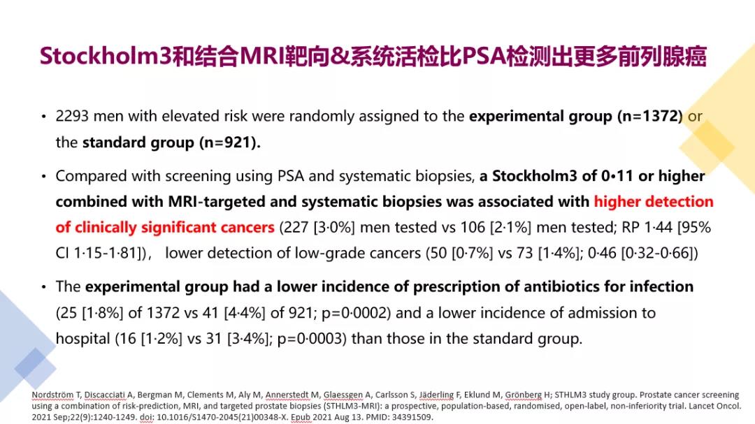 来自斯德哥尔摩的一项研究提出了一种结合风险预测、MRI和靶向穿刺活检的前列腺癌筛查模式——STHLM3-MRI。这种新的模型整合了蛋白标志物、基因标志物以及临床数据多个变量,减少了36%的MRI靶向活检及8%的传统活检程序,同时提高临床显著性前列腺癌(GS≥7分)检出率。