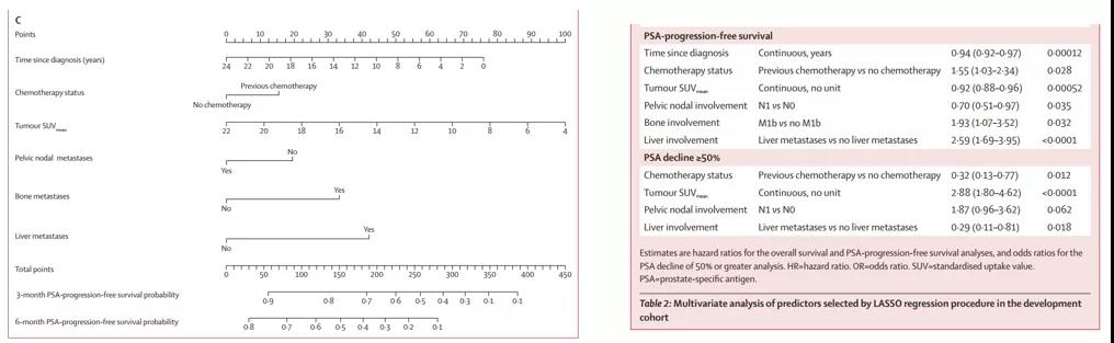 本研究旨在探索在mCRPC阶段的各种标志物预测177Lu-PSMA治疗疗效。在此Nomogram中,PSMA SUV(肿瘤平均标准摄取值standardised uptake value, SUVmean,作为肿瘤PSMA靶蛋白表达的替代测量)是比较重要的指标。研究证实SUV越高患者进展越快。而在177Lu治疗的情景下,SUV越高,患者对于177Lu的疗效反应和PSA下降率就越好。所以,PSMA PET在临床中不但能作为一个诊断的标志物,也能作为一个预后判断的重要工具。