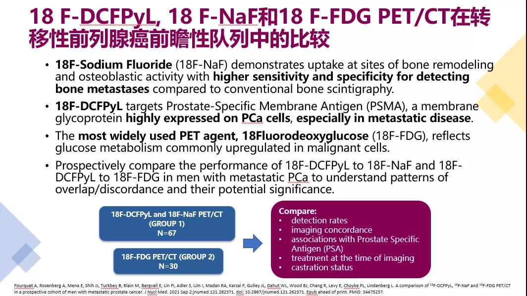 现阶段在前列腺癌的诊断中PET、PSMA都是非常热门的,但本研究比较了三种诊断前列腺癌的显像剂:第一种是基于PSMA的18F-DCFPyL;第二种是NaF,主要诊断骨转移的18F-NaF;第三种是诊断前列腺的代谢标志物18F-FDG PET/CT。这三种标志物的PET反映了前列腺癌诊断不同的层次,在HSPC和CRPC阶段分别有不同的应用情景。