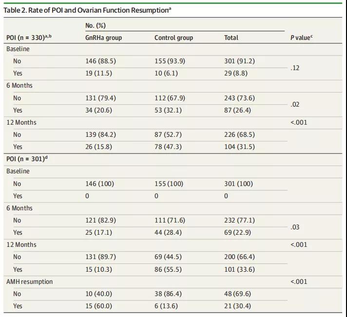 研究最终有330名患者(两组各165名)被纳入初步分析,其中29名患者的基线AMH水平低于0.5ng/mL;共有301名(91.2%)患者符合主要终点分析的条件,GnRHA组和对照组的平均(SD)年龄分别为40.6(6.7)岁和40.2(5.9)岁。