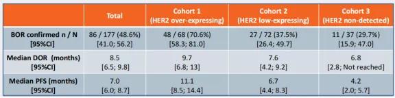 中位随访15.6个月后,ITT人群中研究者评估的BOR为48.6%(86/177),HER2过表达队列为70.6%(48/68)、HER2低表达队列为37.5%(27/72)、HER2未检出队列为29.7%(11/37)。ITT人群中位DoR为8.5个月,HER2过表达队列为9.7个月,HER2低表达队列为7.6个月,HER2未检出队列为6.8个月。ITT人群中位PFS为7.0个月,HER2过表达队列为11.1个月,HER2低表达队列为6.7个月,HER2未检出队列中位PFS为4.2个月。