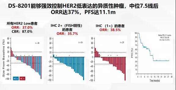 除对HER2+乳腺癌患者疗效显著外,已有体内模型和临床研究显示T-DXd对HER2低表达肿瘤有效。T-DXd首次人体I期试验DS8201-A-J101研究13纳入了HER2低表达晚期不可切除或转移性乳腺癌乳腺癌 (IHC 2+/ISH-,IHC 1+/ISH-或IHC 1+/ISH未检测),研究结果显示,截至2019年2月,54名患者达到了研究终点。ORR为37%,疾病控制率为87%,中位PFS为11.1个月,中位缓解时间为10.4个月。所有亚组均观察到了疗效,包括HR+/-、HER2 IHC评分1+/2+以及既往CDK4/6i经治的乳腺癌。研究安全性数据显示,最常观察到的不良事件是胃肠道和血液学毒性,可能与药物的化疗成分有关。需要特别关注的不良事件有非感染性肺炎/ILD 、左心室功能障碍。