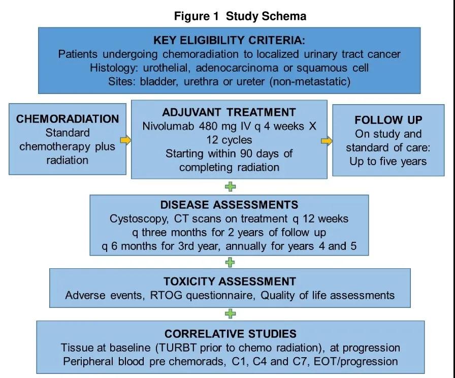 在NEXT研究(NCT03171025)中,研究人员正在招募接受标准放化疗(CRT)的局限性MIBC患者。参与者在完成CRT后的90天内开始每4周静脉注射纳武利尤单抗480 mg(最多12剂)。前两年每3个月进行一次膀胱镜检查和基于影像学的评估。