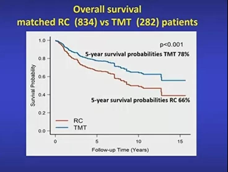 配对队列共有1116例患者(834例RC患者和282例TMT患者)。匹配后,RC和TMT队列的年龄(71.3 vs 71.6%)、cT2临床分期(88 vs 90%)、肾积水(12 vs 10%)和(新)辅助化疗的使用(60 vs 65%)相似。经TMT治疗的38例患者(13%)进行了挽救性膀胱切除术。