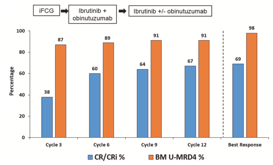 共41名患者完成12周期治疗(4名患者退出临床试验)。所有41名患者均达到骨髓U-MRD(30例CR/CRi,11例PR)。所有患者在12周期后均未继续使用Ibrutinib。中位随访24.9个月时,3名患者外周血MRD转阳但无临床进展表现(这些患者正在接受密切观察、未行治疗)。1名患者在第9周期治疗期间因充血性心力衰竭死亡(既往无心脏病史),后续分析或与使用Ibrutinib相关。1名患者发生治疗相关MDS:该患者基线时为二倍体核型,12周期治疗结束时获得CR以及骨髓U-MRD,但是在12周期疗效评估时变为复杂核型,但骨髓未见骨髓增生异常;血细胞无减少。