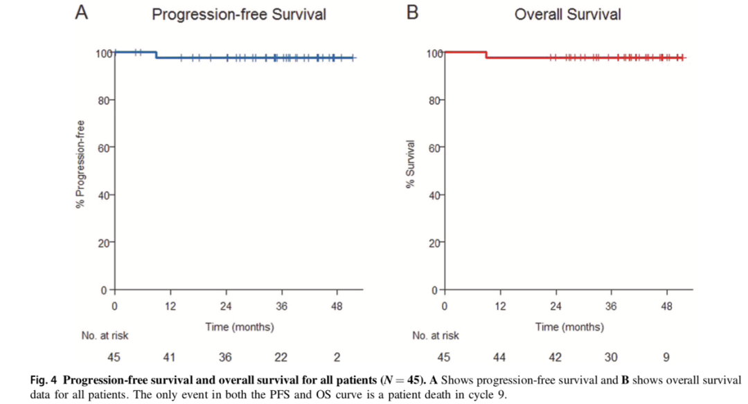 患者的生存情况:3年PFS率和OS率分别为98%和98%。没有患者发生Richter转化,1例患者治疗期间死亡。(图4)