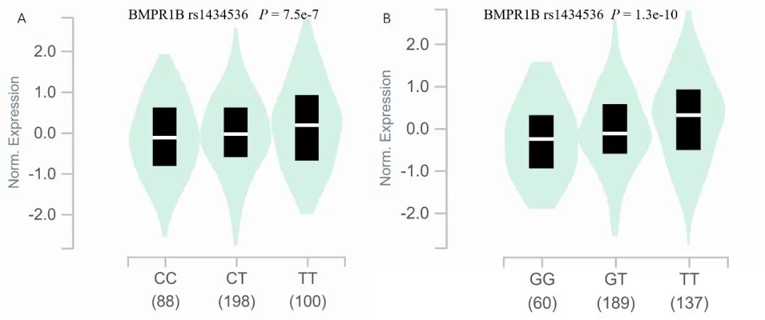 通过GTEx数据库我们发现,rs1434536 T和rs1970801的次要等位基因会使BMPR1B的表达水平升高(见下图)。