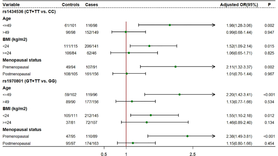 我们发现rs1434536的T等位基因与乳腺癌易感性增加相关[CT+TT与CC:调整后的OR(95%CI)=1.35(1.02~1.78),Padjusted=0.034;CT与CC调整后的OR(95%CI)=1.39(1.03~1.87),Padjusted=0.029]。对于rs1970801,携带次要等位基因T与乳腺癌风险增加显着相关[GT+TT与GG:调整后的OR(95%CI)=1.52(1.14~2.01),Padjusted=0.004;GT与GG调整后的OR(95%CI)=1.56(1.15~2.09),Padjusted=0.004]。分层分析发现,rs1434536和rs1970801在年龄小于49岁、BMI低于24 kg/m2的女性和绝经前女性中与乳腺癌易感性统计学相关(见下图)。
