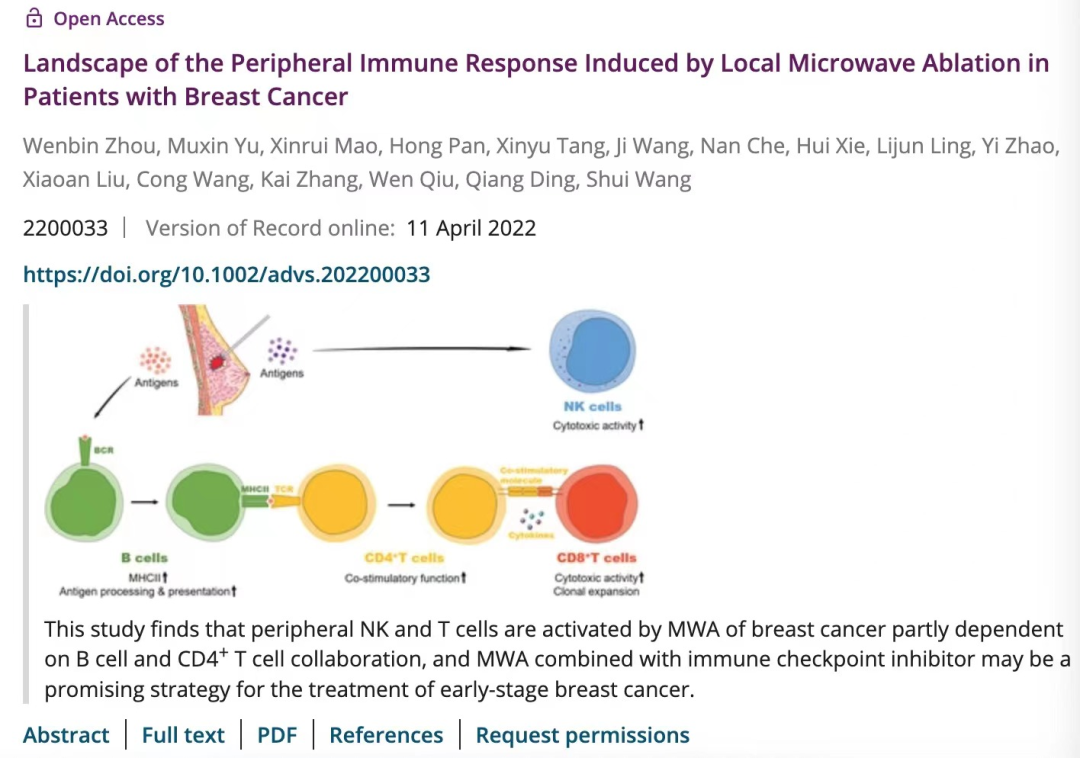 日前,江苏省人民医院乳腺疾病诊疗中心王水教授团队在Advanced Science(IF=16.806)发表了最新研究成果,描绘了乳腺癌局部微波消融术诱导的全身免疫反应图谱及其产生机制。