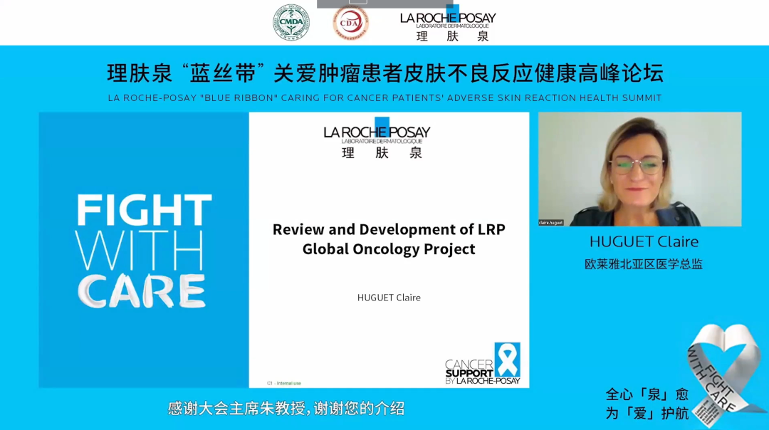 欧莱雅北亚区医学总监 HUGUET Claire女士回顾了理肤泉自2012年开始在肿瘤领域设立的临床研究项目,并汇报了全球30多个国家开展的关爱肿瘤患者皮肤健康项目的进程。