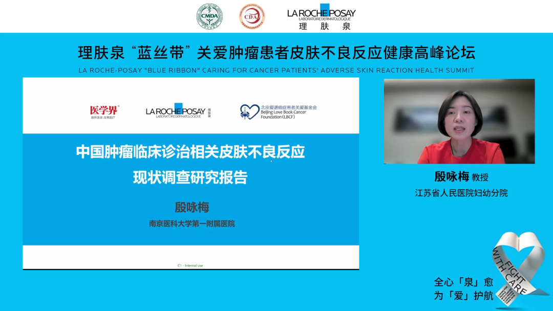 江苏省人民医院妇幼分院殷咏梅教授重磅发布了我国首个《中国肿瘤临床诊治皮肤不良反应现状调查研究报告》。该报告在CDA及CSCO指导下,由医学界、北京爱谱癌症患者关爱基金会携手理肤泉共同打造。报告显示,中国肿瘤患者的皮肤不良反应整体有效控制程度较低、肿瘤医生对患者皮肤不良反应的重视程度有待提升,但是越来越多的医生已经意识到皮肤不良反应管理对患者生存质量的重要性,近八成肿瘤医生希望与皮肤科有更深的学术及临床经验交流,帮助患者改善皮肤健康。因此,殷咏梅教授期待进一步加强皮肤科和肿瘤科之间的交流协作,寻求更切实有效能够帮助解决皮肤健康问题的方法。