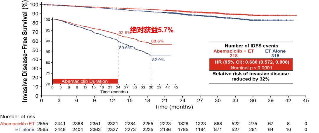 研究设计:全球Ⅲ期monarchE研究,共纳入5637名早期HR+/HER2-患者,按照1∶1随机分为队列1(N=5120)和队列2(N=517),队列1具有较高的复发风险。两组均接受为期2年的阿贝西利联合ET或单独ET辅助治疗,本次报道队列1研究结果。