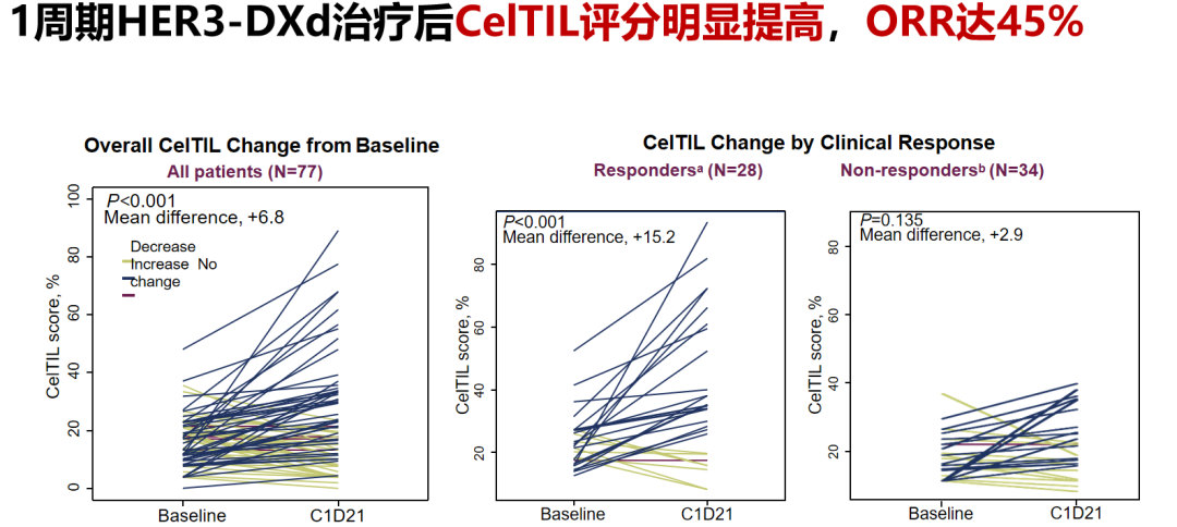 研究方法:纳入未经治疗HR+/HER2-可手术(≥1cm)乳腺癌患者,根据治疗前ERBB3 mRNA水平对患者从高到底进行分类,所有患者均给予单剂量HER3-DXd(6.4 mg/kg)治疗。主要终点是评估用药前后(第1周期第21天,C1D21)样本之间的CelTIL评分差异。次要研究终点包括:C1D21时临床评估的客观缓解率(ORR)以及安全性和耐受性等。