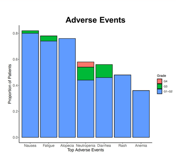 在携带BRCA突变的患者中(n=8),7例在SG治疗后直接进行手术,6例达到pCR(75%,95% CI:42%~99%)。SG患者最常见的不良反应为恶心(82%,n=41)、疲劳(78%,n=39)、脱发(76%,n=38)、中性粒细胞减少(58%,n=29)、贫血(36%,n=18)和皮疹(48%,n=24)。6%的患者需要减少剂量。无患者因疾病进展或不良反应而停止SG治疗。在数据截止时(22年1月18日),没有患者出现疾病复发。
