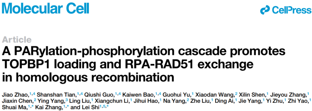 2022年5月20日,天津医科大学石磊课题组和张锴课题组在Molecular Cell杂志(影响因子17.9,JCR1区)上合作发表了题为“A PARylation-phosphorylation cascade promotes TOPBP1 loading and RPA-RAD51 exchange in homologous recombination”的研究成果,该研究对乳腺癌患者的同源重组修复调控模式进行了介绍。