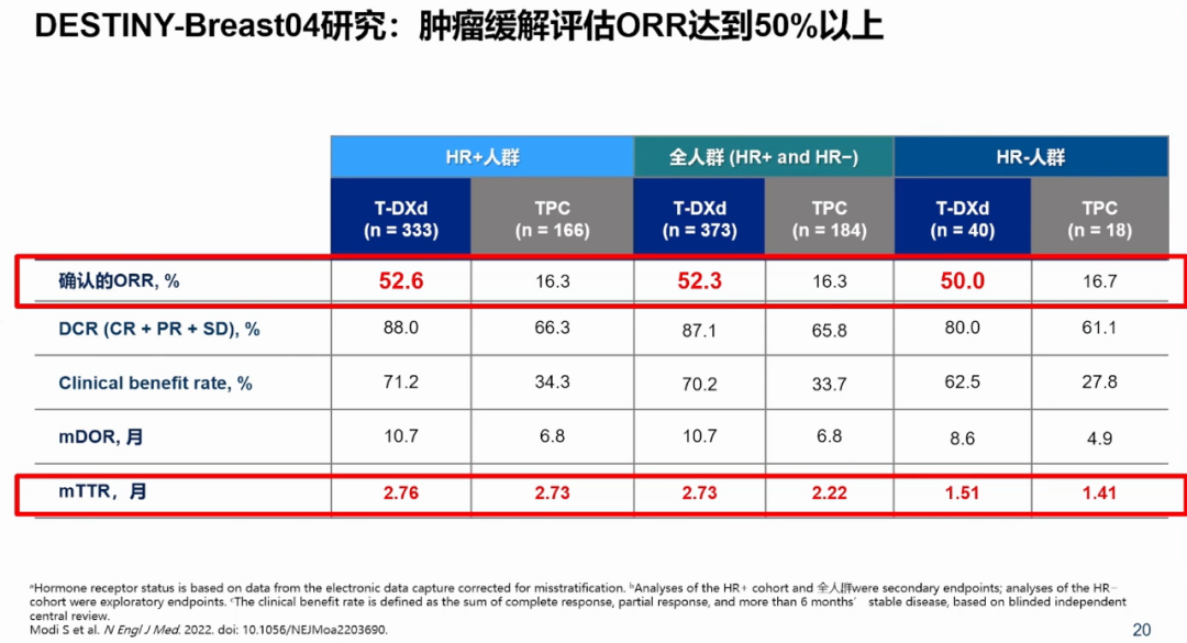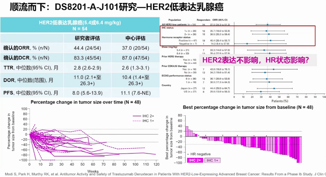 在针对HER2低表达晚期乳腺癌的1期DS8201-A-J101研究中,T-DXd在既往中位治疗达7.5线的情况下,仍可获得高达44.4%的ORR(研究者评估),亚组分析显示HER2表达(1+或2+)并不影响ORR,HR阳性的ORR高于HR阴性,后者属于临床中真正意义上的三阴性乳腺癌。