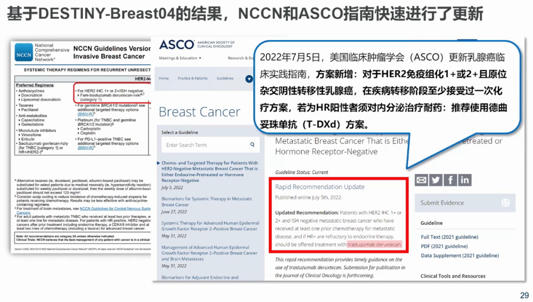 DESTINY-Breast04研究的阳性结果支持T-DXd成为HER2低表达晚期乳腺癌治疗的新标准,T-DXd也成为第一个在此类人群中获得PFS和OS双阳性结果的抗HER2疗法。近期,NCCN、ASCO等国际指南迅速做出更新,将T-DXd用于HER2低表达(IHC 1+或2+且FISH-)且至少接受过一次化疗的转移性乳腺癌患者(HR+患者为内分泌耐药)。